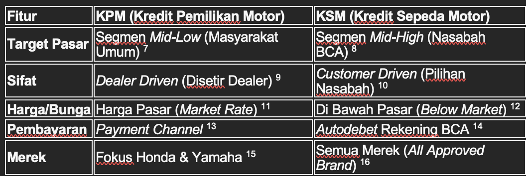 KSM (Kredit Sepeda Motor) menawarkan kemudahan 'One Stop Service' di Bank (unit dicarikan), tenor fleksibel (9-48 bulan), dan autodebet BCA. Berbeda dengan KPM (Umum) yang mengharuskan nasabah mencari unit sendiri ke dealer dengan tenor kaku sesuai pricelist.